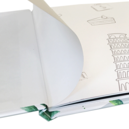 Every hardcover booklet comes with flyleaves, one in the front of the book and one in the back attached to the inside of the cover. Flyleaves can not be printed.